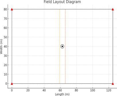The field is rectangular, typically 125 meters long and 80 meters wide, divided into two halves. The central point is in the middle of the playing area. Two lines (Ghai) are drawn at a distance of 12 ft on each side of the centre. Four flags are placed in the four corners. On the central point which is equidistant from the two halves, a circle is drawn, known as Gher.