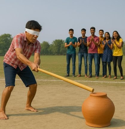 They try to locate the pot by listening to the cheering and clapping of others. Once the player feels confident, they strike the stick on the ground, aiming to hit and break the pot.