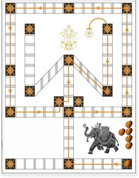 The two-player race game is played with cowrie shells or daṇḍaka-pāśa (stick dice). It blends skill and chance, and trains decision-making and strategy. The typical age for the game is above 6 years.